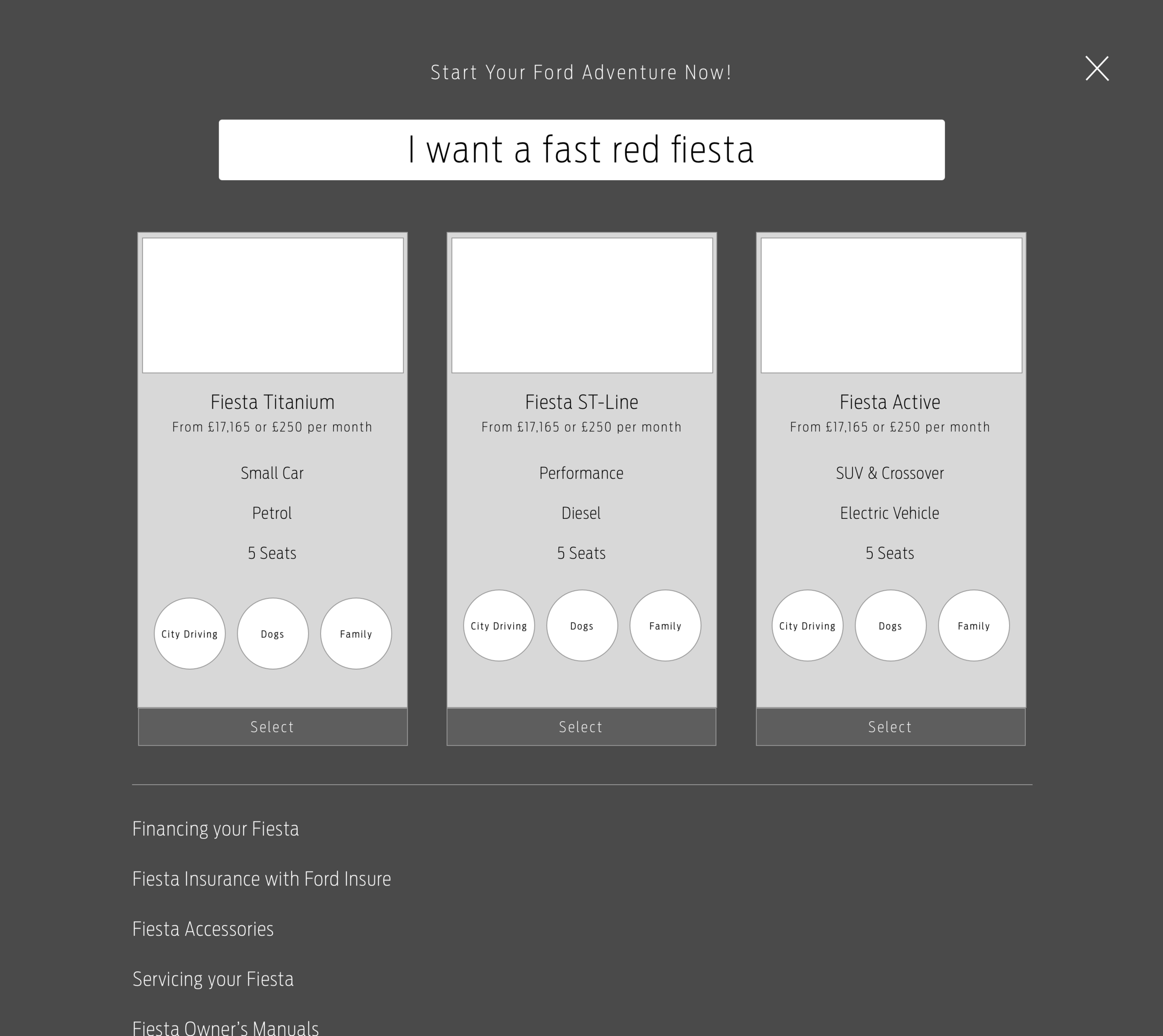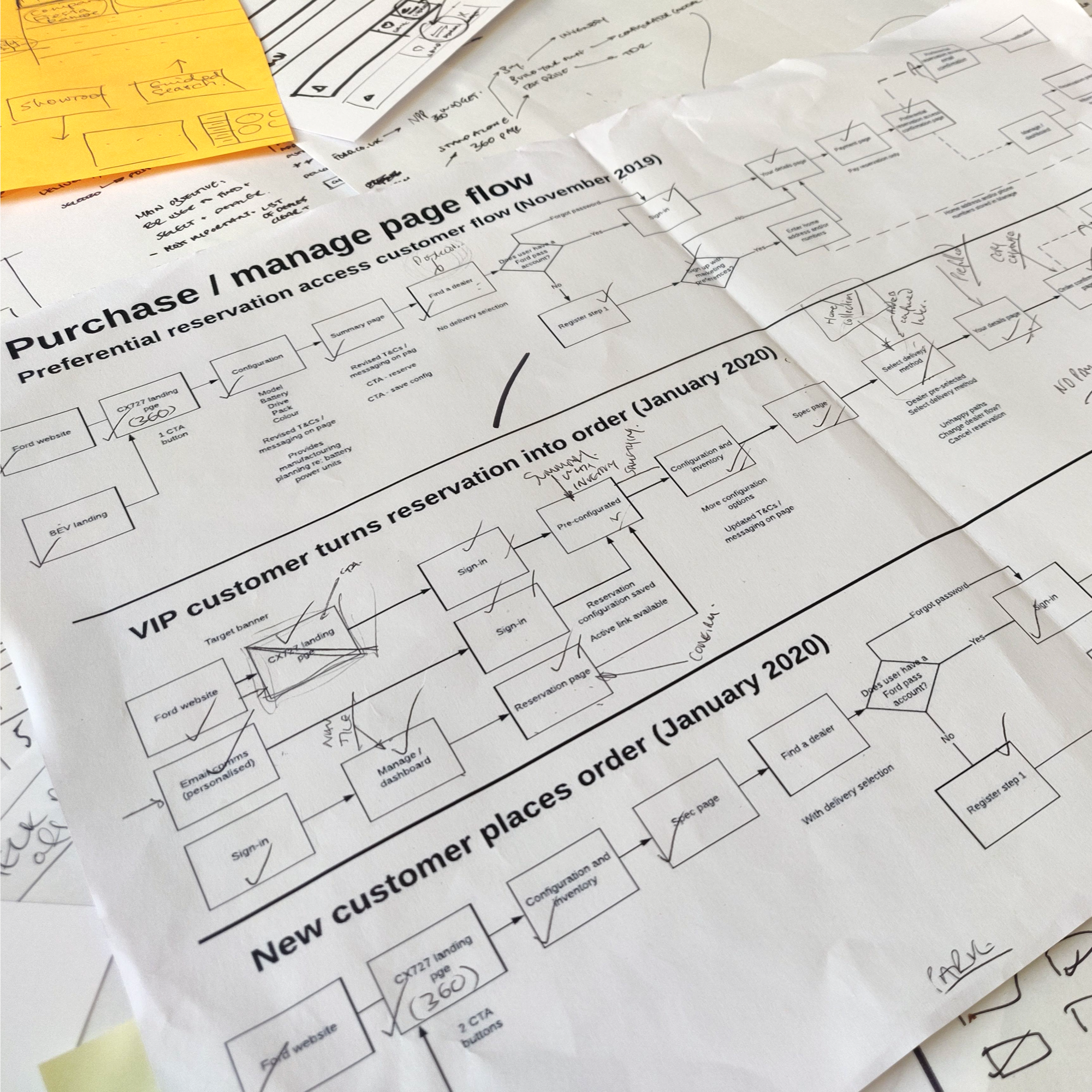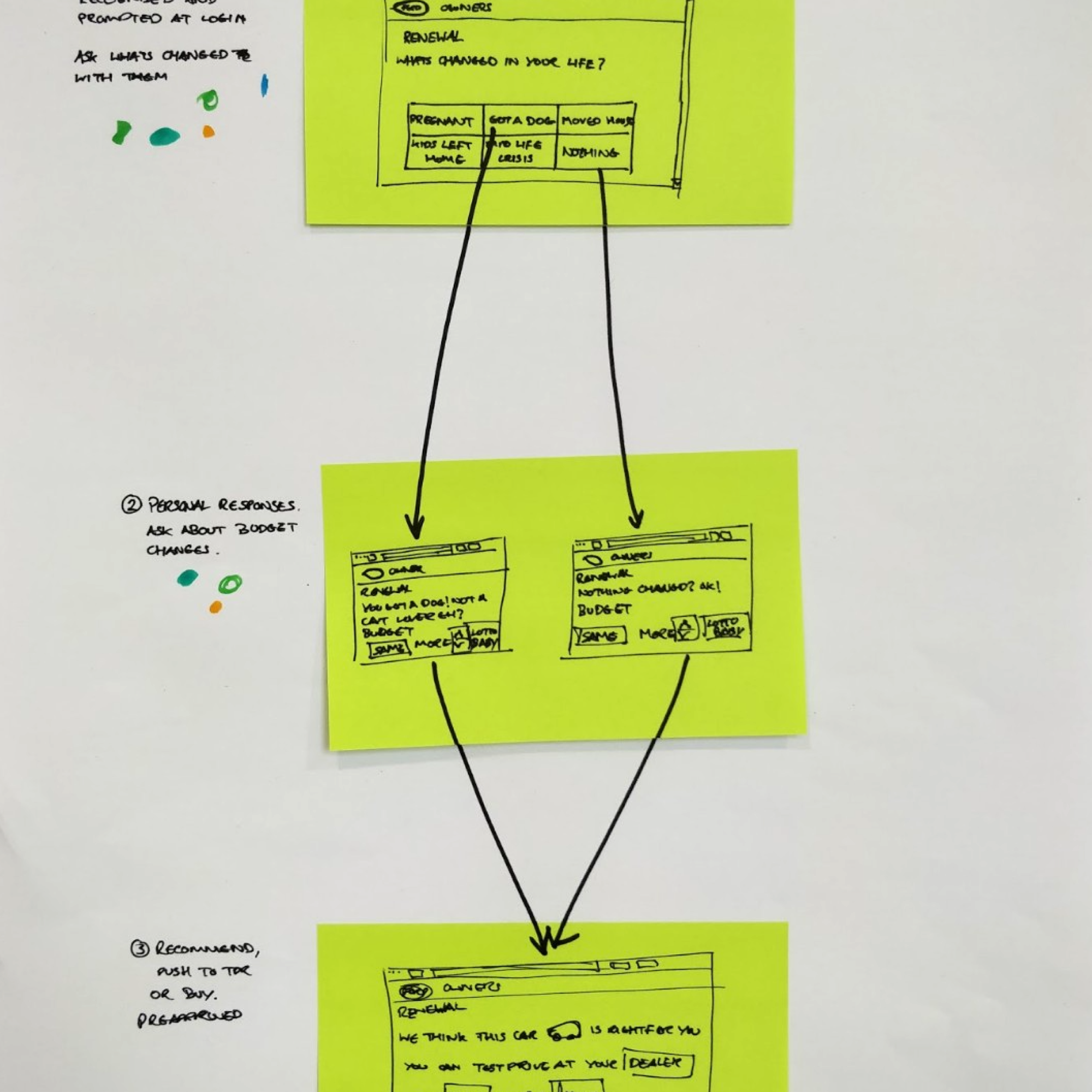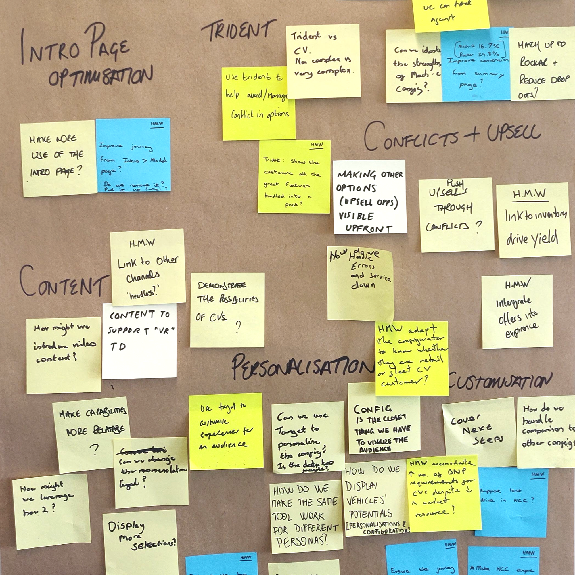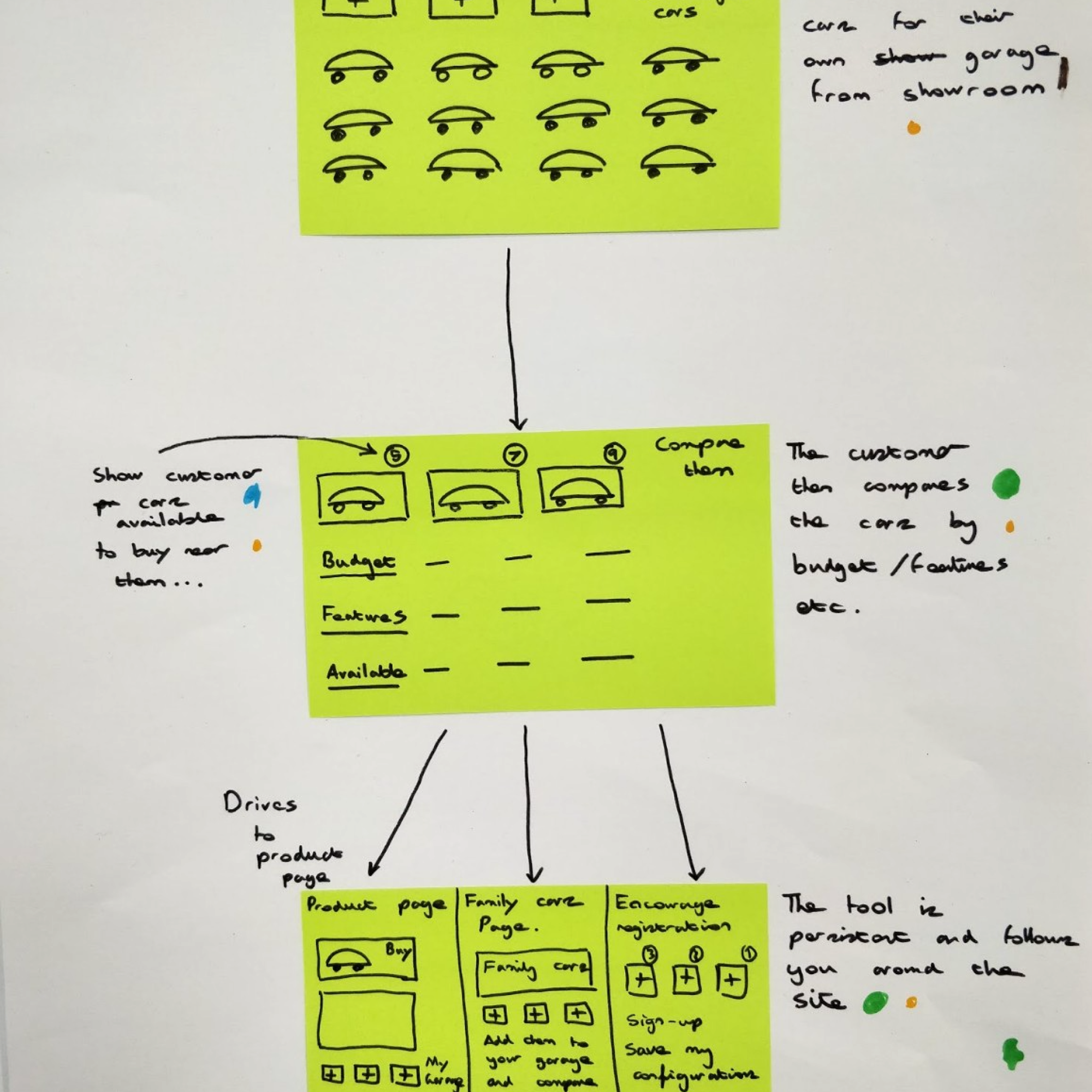 Ecommerce would be a new part of Ford’s website that would be built from nothing and so it was a good opportunity to take a more creative, open-minded approach that would allow for everyone in the team to contribute. Having identified the key areas of search, discovery and purchase, methods including “How We Might”, Crazy 8’s and Solution Sketch were put into practice with dot voting used to help decide on the ideas that would be investigated further.