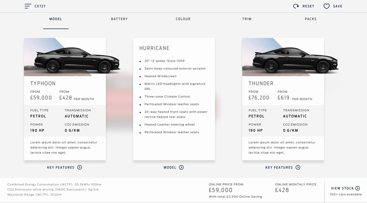 The inclusion of key data points and features aimed to facilitate a high-level comparison, while the introduction of mandatory steps at the beginning of the configurator experience would break the process up, visually, and would reduce the number of conflicts further down the line. This consideration would benefit the experience when integrating Ford’s full vehicle range.