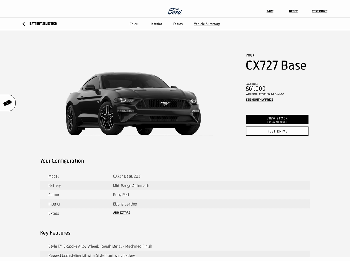 Before progressing into the purchase funnel, the user would have the opportunity to review their customised Mach-E, alongside indicative pricing, and the vehicle’s key specifications. The inclusion of content such as dimensions, infotainment and maintenance would provide further support to help customers who were still unsure of the product offering.