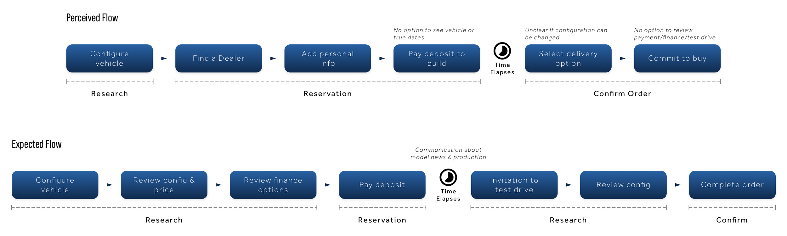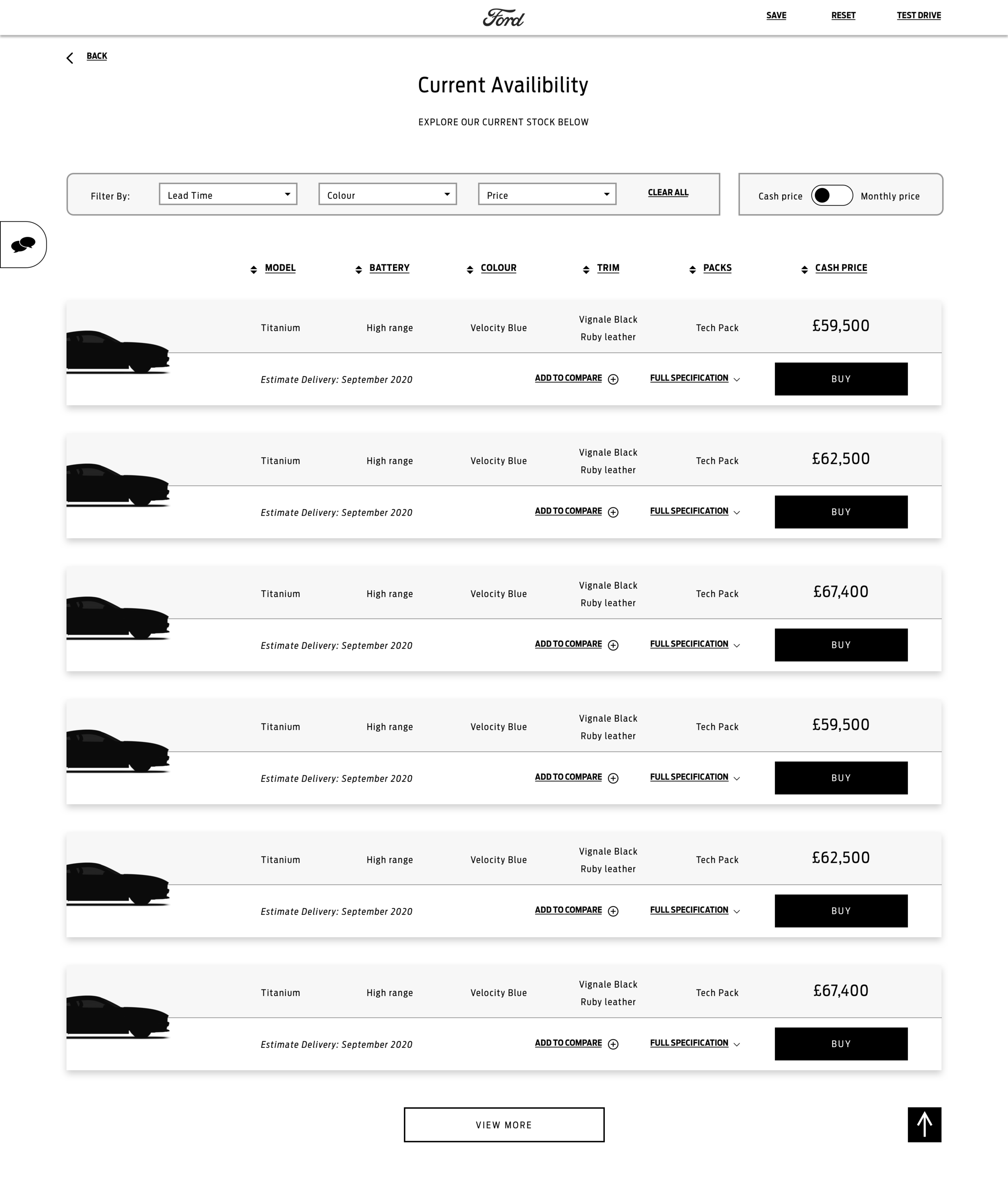 The outputs were evolved into tangible concepts, which would be taken through to user testing. Focusing on the facilitation of discovery when looking for the perfect car, the early interviews provided users with effective and engaging entry points into what would be the purchase flow. While a number of concerns had been flagged, mainly around the product page and the inventory, there was now an urgency to begin work on building out the reservation journey that would launch in late 2019.