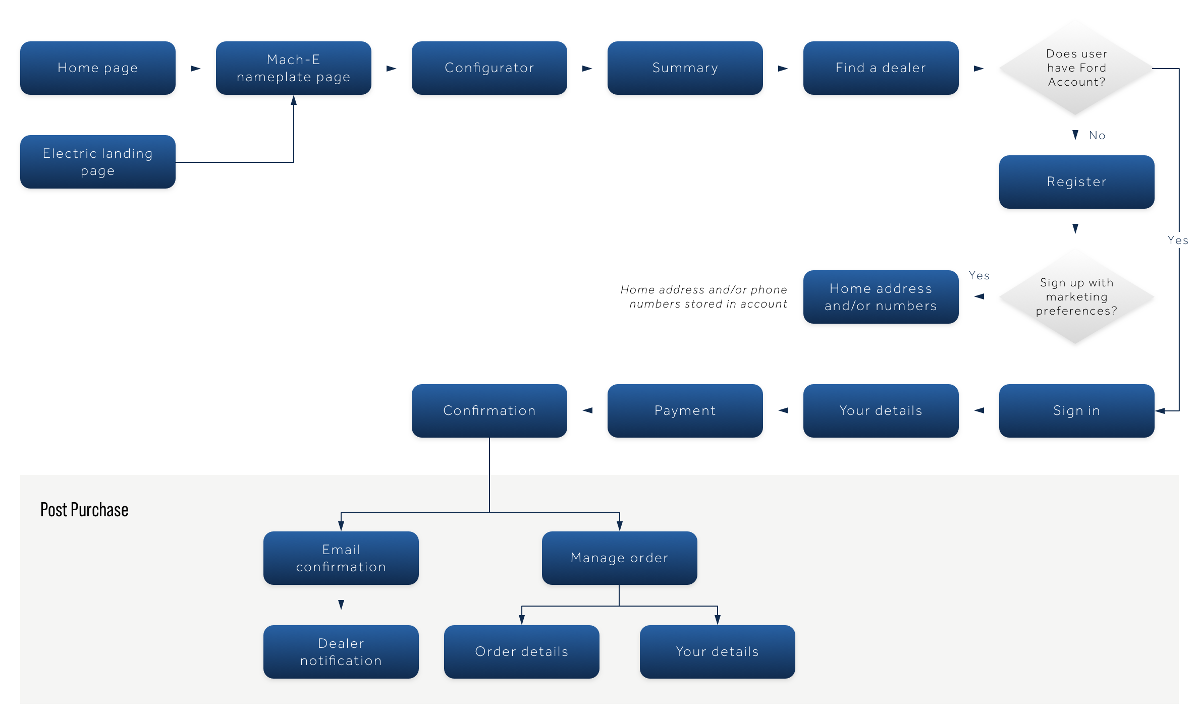 The all-new, all-electric Mustang Mach-E was unveiled in November 2019 and Ford wanted to give consumers the opportunity to pre-order the vehicle online. I played an integral role in Ford’s transition into a global ecommerce platform that would see a major change in the way users interacted with the website, and more significantly, how Ford customers purchased vehicles in future.